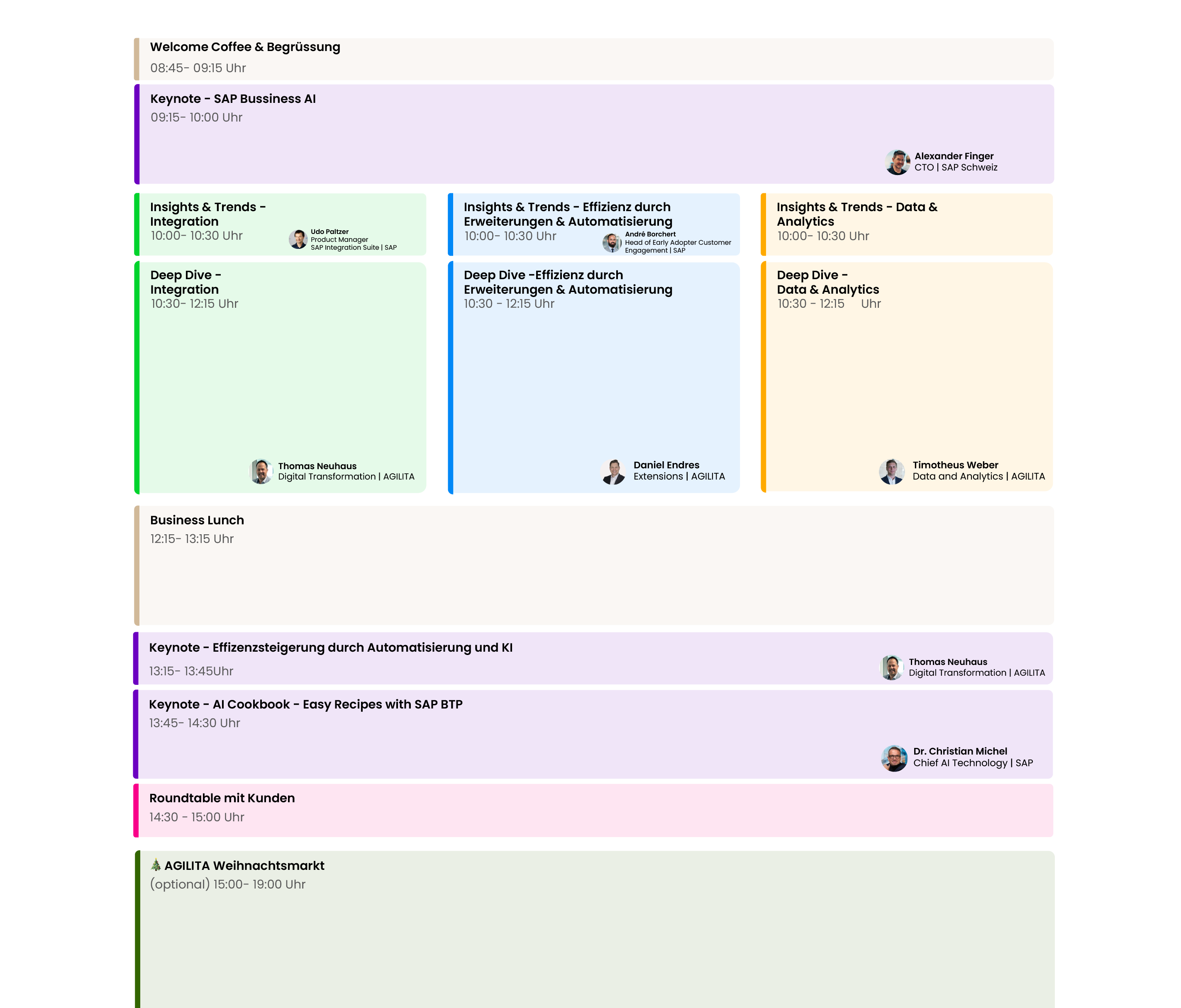 Mit den Produktverantwortlichen von SAP sind Sie direkt an der Quelle der Innovation! In spannenden Keynotes geben Christian Michel und Alexander Finger exklusive Einblicke in die neuesten Entwicklungen rund um Automatisierung und Effizienzsteigerung durch KI.