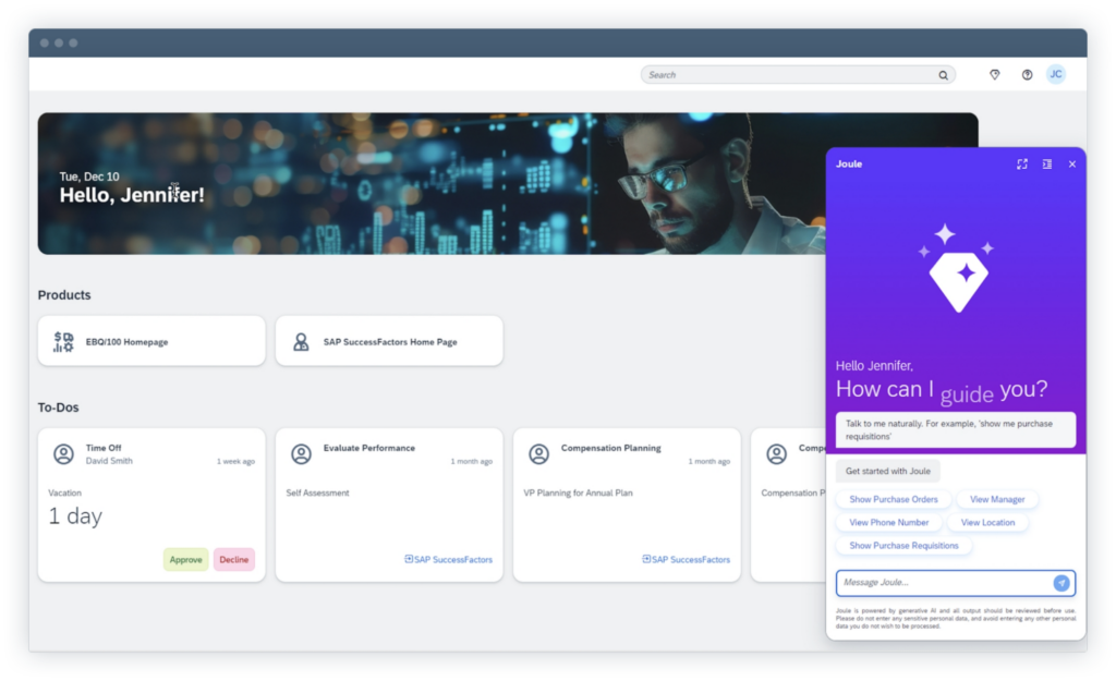 With SAP Business AI and Joule Studio, you can integrate Generative AI into your applications: from automatic code generation to intelligent agents that control complex workflows. Responsible AI practices and access to optimized large language models set new standards for productivity and innovation.